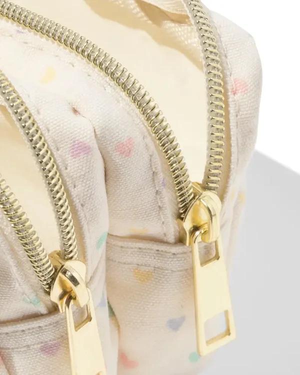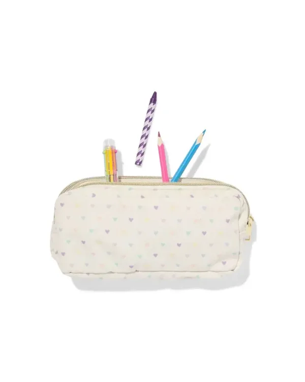 La couleur crème est décorée de petits cœurs colorés. Grâce aux doubles compartiments, vous pouvez emporter tous vos crayons 🖍 ou même vos maquillage 💄 de manière organisée, ce qui est idéal pour l'école ou les sorties 😉👍